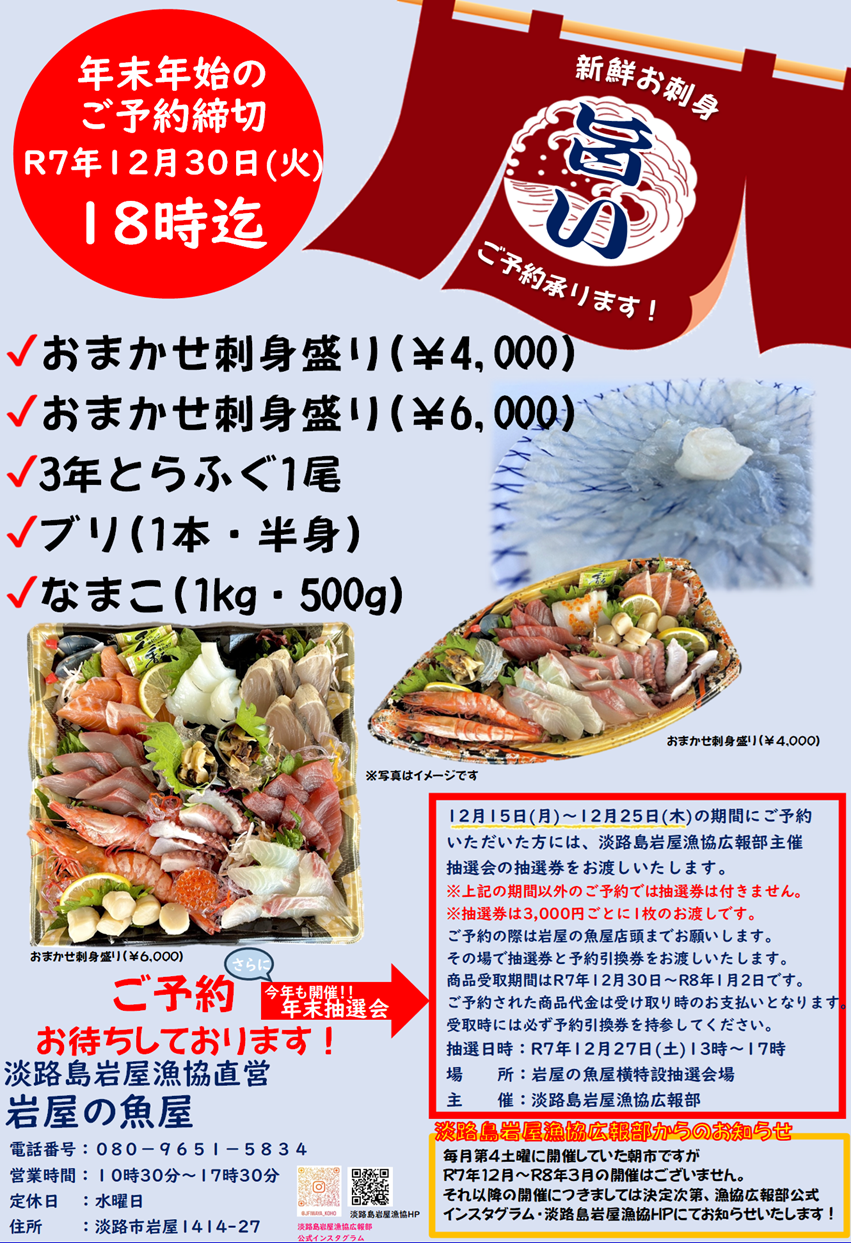 抽選券は12月15日(月)から12月25日(木)の間に岩屋の魚屋で年末年始商品をご予約いただいた方が対象です。